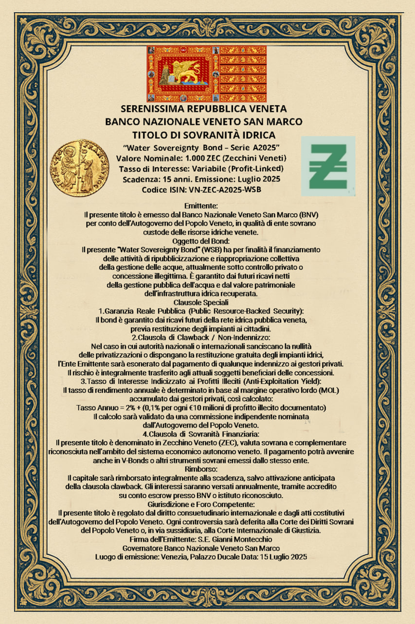 Il BNVSM offrirà un bonus di benvenuto di 2000 Zecchini (ZEC) ai primi 10.000 intestatari che apriranno un conto corrente gratuito in ZEC. Un gesto simbolico e concreto per avviare il nuovo corso dell’economia veneta con fiducia, partecipazione e spirito comunitario. Clicca qui e segui le indicazioni per aprire il Tuo conto digitale. APERTURA CONTO DISPONIBILE PER CHIUNQUE NE FACCIA RICHIESTA NEL MONDO: CITTADINI AUTODETERMINATI E CITTADINI NON AUTODETERMINATI. SCADENZA BONUS 31.07.25