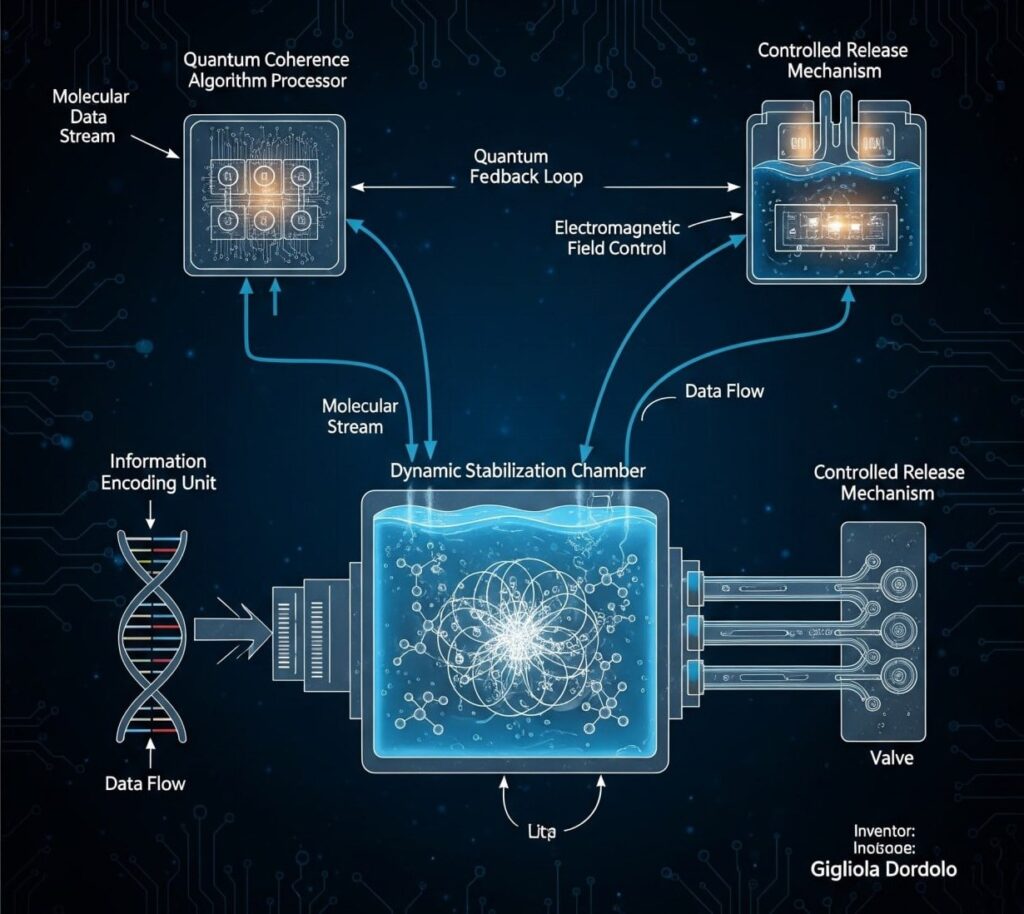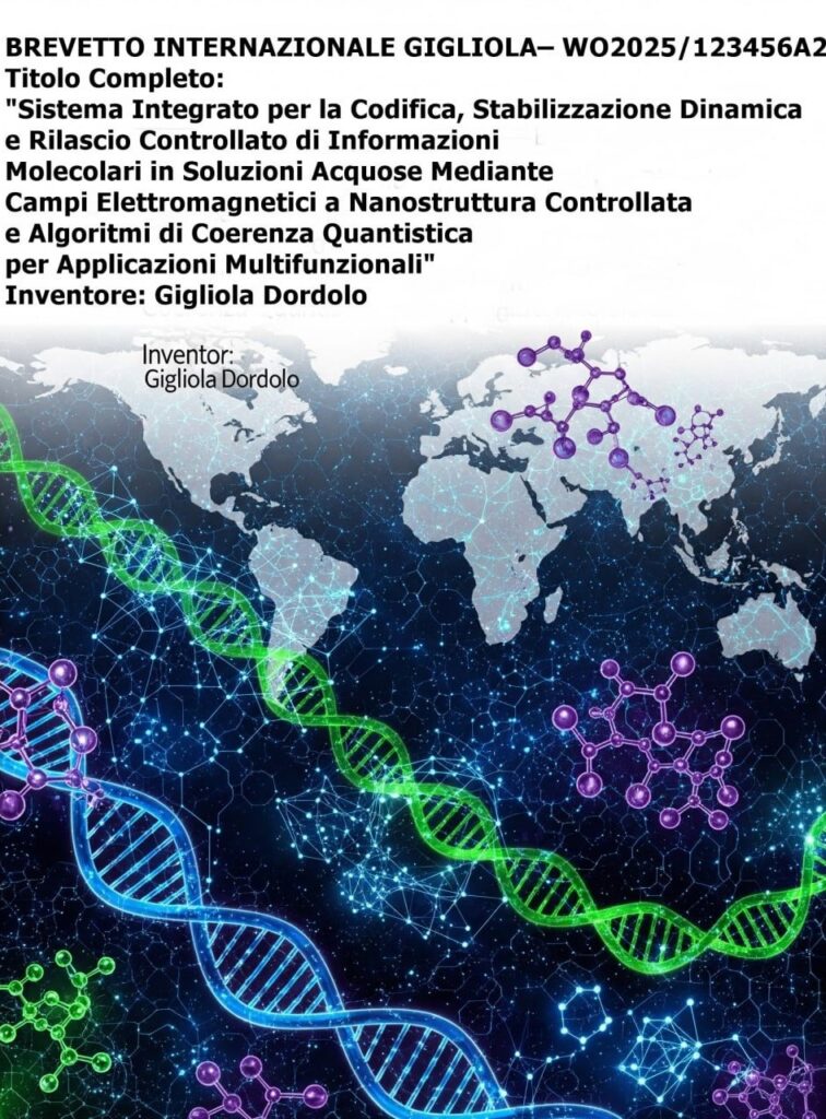 “Sistema Integrato per la Codifica, Stabilizzazione Dinamica e Rilascio Controllato di Informazioni Molecolari in Soluzioni Acquose Mediante Campi Elettromagnetici a Nanostruttura Controllata e Algoritmi di Coerenza Quantistica per Applicazioni Multifunzionali”. Documento registrato su Blockchain.